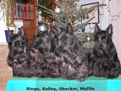 The annual German Scottie-Special was held this year in Münster. The judge was the Scottie Breeder Vandra Huber from the USA (kennel McVan). Here are our results: Bingo 1st in champion class, Muffin 1st in open class and dog CC; Perla 2nd in junior class (Res Junior CC) and Bambina 2nd in champion class and Res CC ticket.